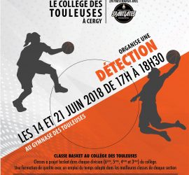 Le collège des Touleuses organise deux détections, en partenariat avec les Spartiates, les jeudi 14 et 21 Juin. Ces dernières vont permettre de déterminer les jeunes qui pourront intégrer la classe basket des Touleuses lors de l’année 2018/2019. Les deux séances seront dirigées par Kalilou KAMARA et Mostapha EL HAFIDI. Attention, pour participer, il faut faire partie du secteur du collège. Les six écoles du secteur du collège sont : Les Châteaux, Les Touleuses, Les Larris, Les Plants, Le Village, Les Maradas Pour participer à la détection, merci de remplir la détection suivante : www.cergypontoisebb.fr/img/fiche_college_inscription.pdf